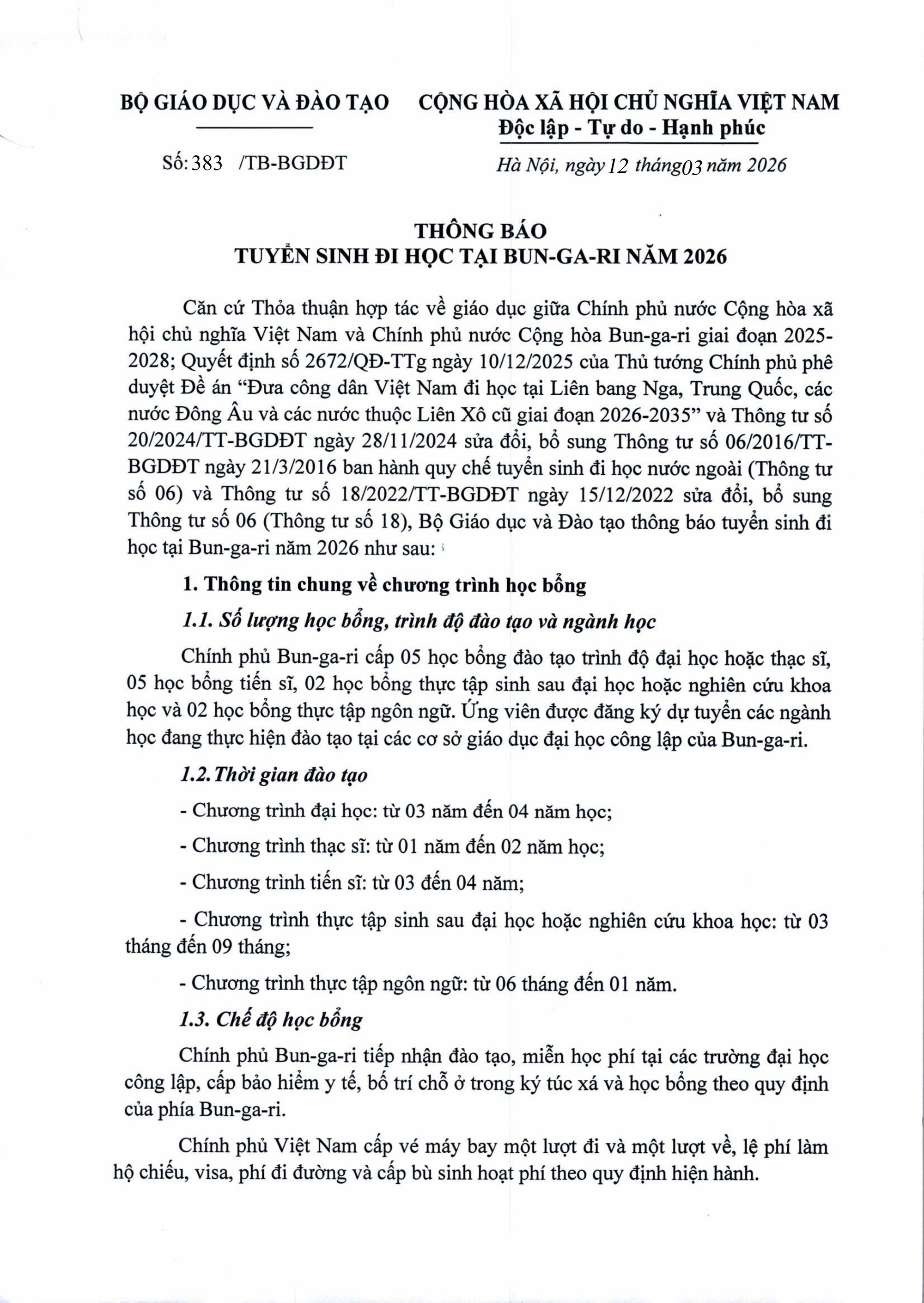 Theo đó, UBND xã Thường Tín thông báo tới các tổ chức, cá nhân và toàn thể Nhân dân trên địa bàn xã về chương trình tuyển sinh học bổng đi học tại Bungari năm 2026. Đây là cơ hội để học sinh, sinh viên được học tập trong môi trường quốc tế, tiếp cận nền giáo dục tiên tiến, góp phần nâng cao trình độ chuyên môn, ngoại ngữ và kỹ năng hội nhập.