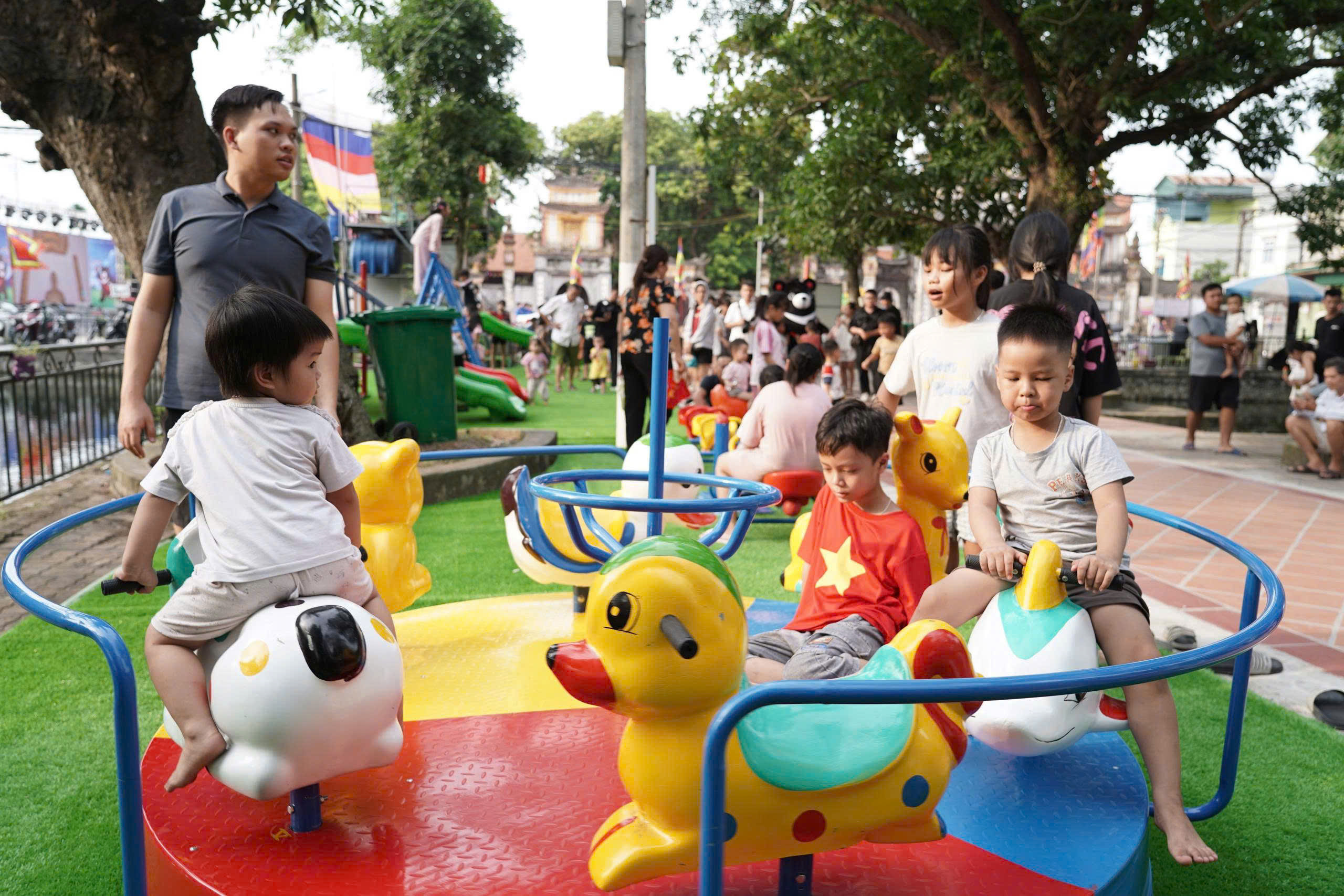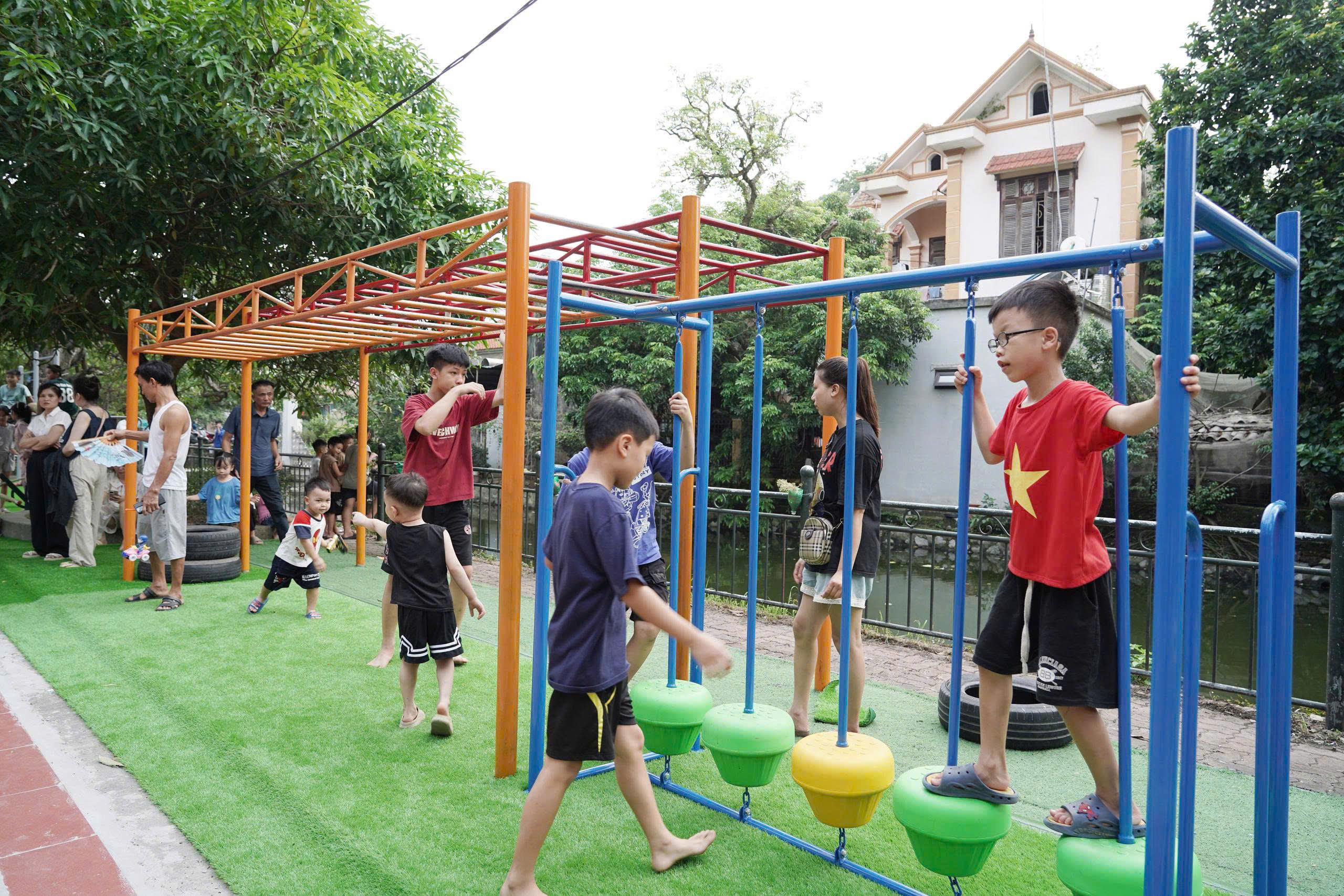 Các em thiếu nhi thích thú trải nghiệm các trò chơi và dụng cụ thể thao tại sân chơi trẻ em