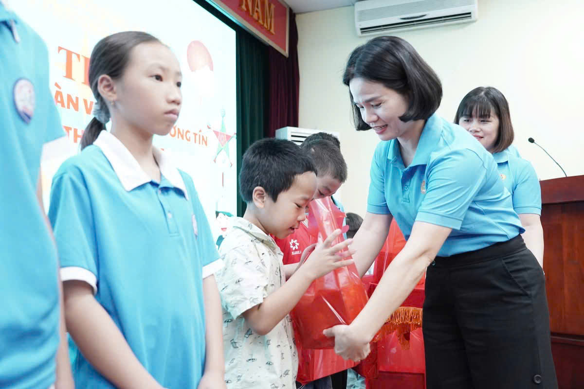Đồng chí Trịnh Thị Phương Thảo - Phó trưởng Ban công đoàn LĐLĐ thành phố Hà Nội tặng quà cho các cháu